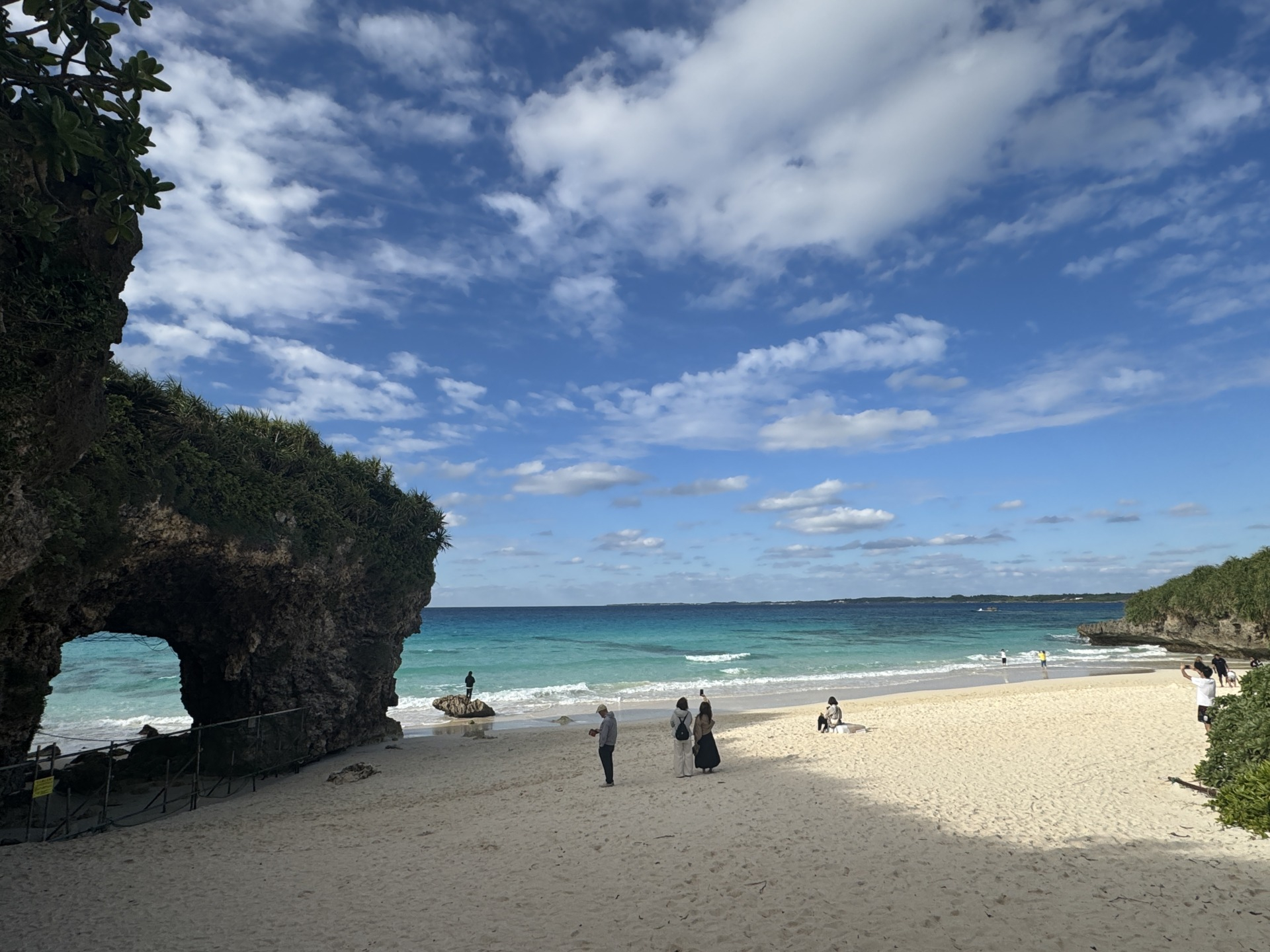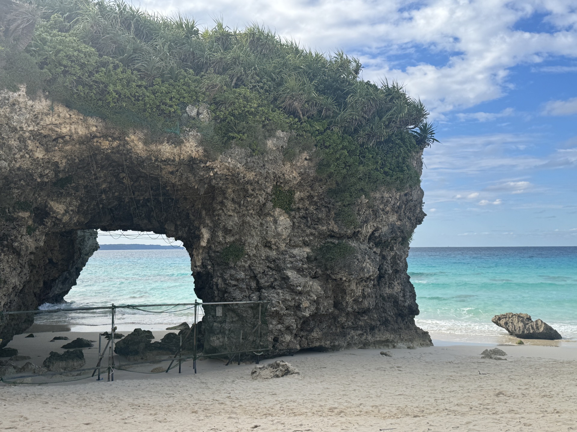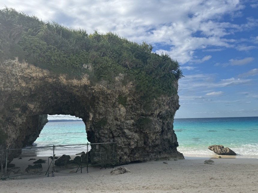 特に有名なのが、ビーチの一角にある岩のアーチ。波と風による浸食で生まれた天然の造形で、宮古島の自然の力を感じさせてくれます。このアーチは砂山ビーチを象徴する存在で、多くの観光客が記念撮影を楽しんでいます。