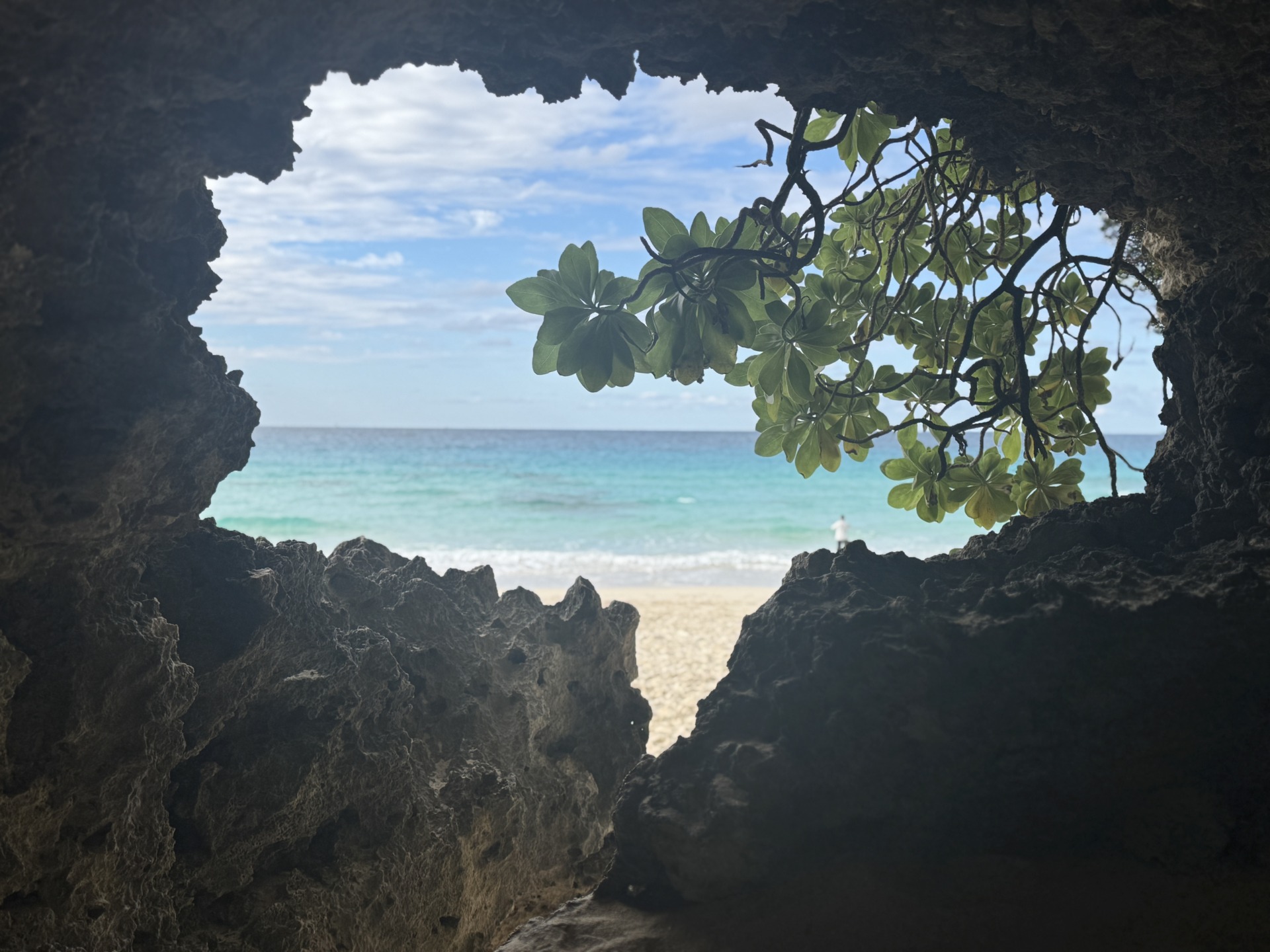 意外と知られていない穴場のフォトポイントで砂浜の奥へ進むと人ひとりが通れる小さな洞窟があり潜ると、窓のように水平線を見渡せるフォトポイントがあります。大人の方でも入れますが、自然の洞窟のため怪我をしないようご注意ください。