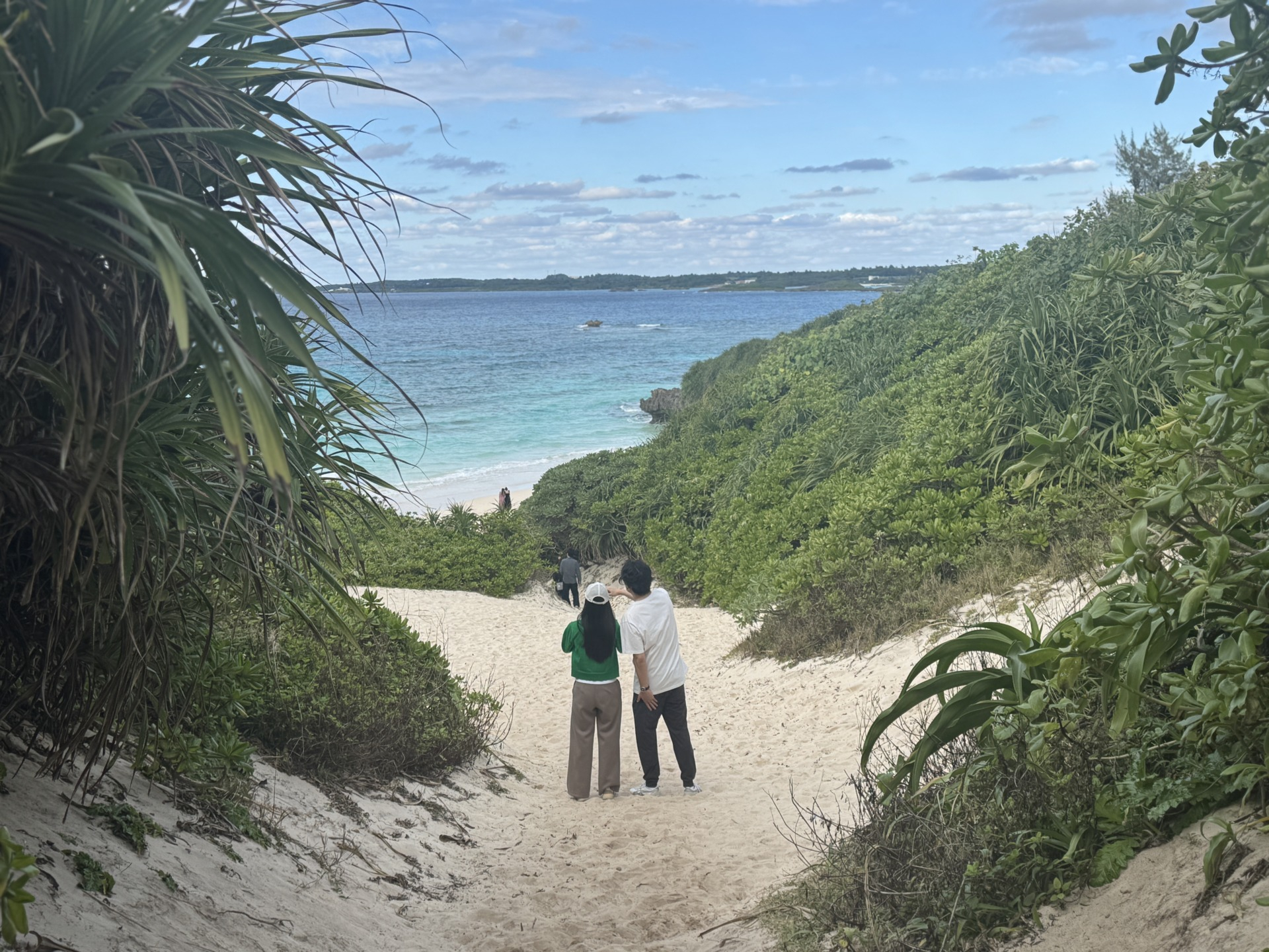駐車場からビーチまでは、砂でできた小さな丘を越えて進みます。この“砂山”を下りきった瞬間に目の前に広がる景色は圧巻で、思わず息をのむほどの絶景が広がります。