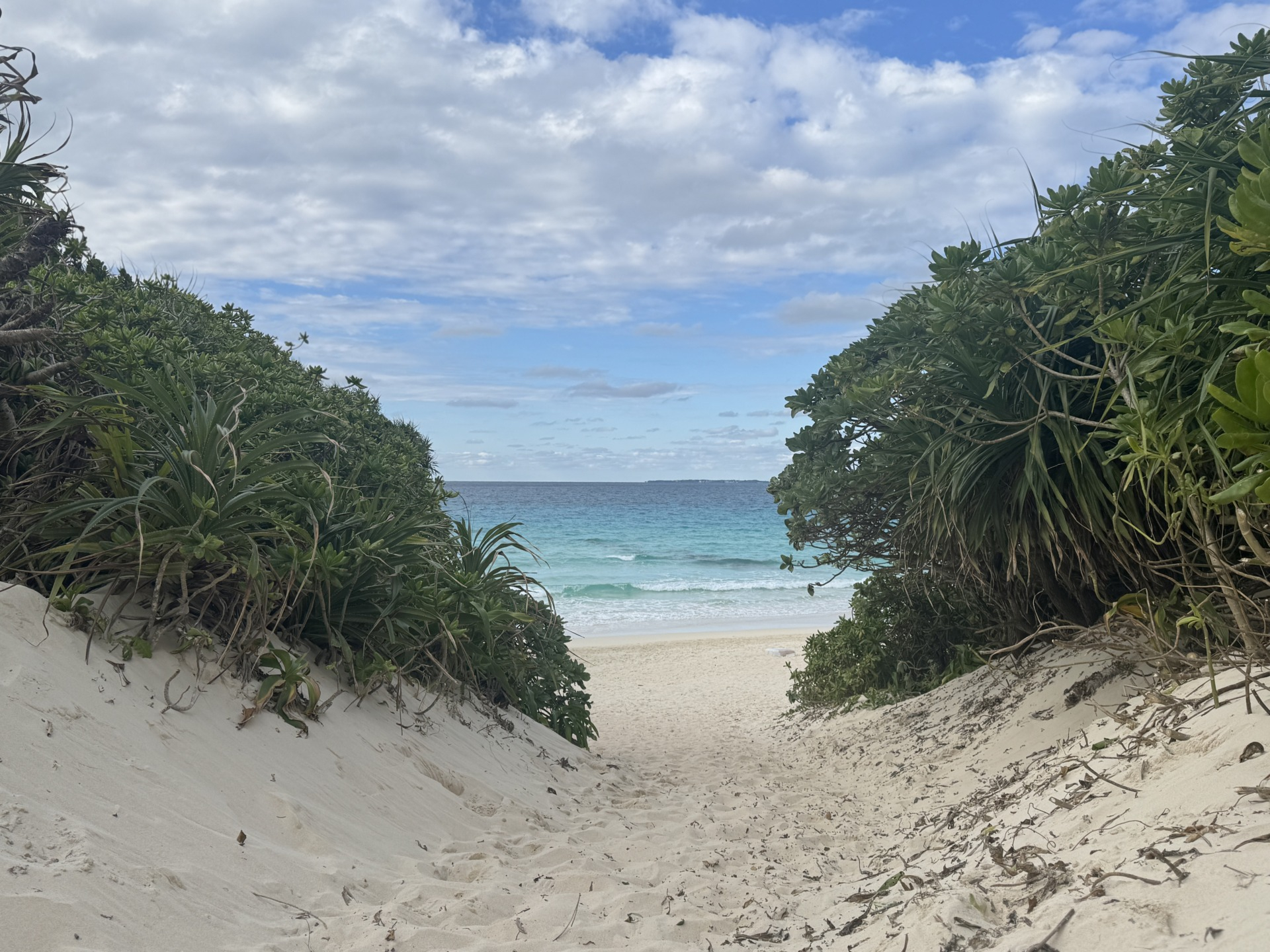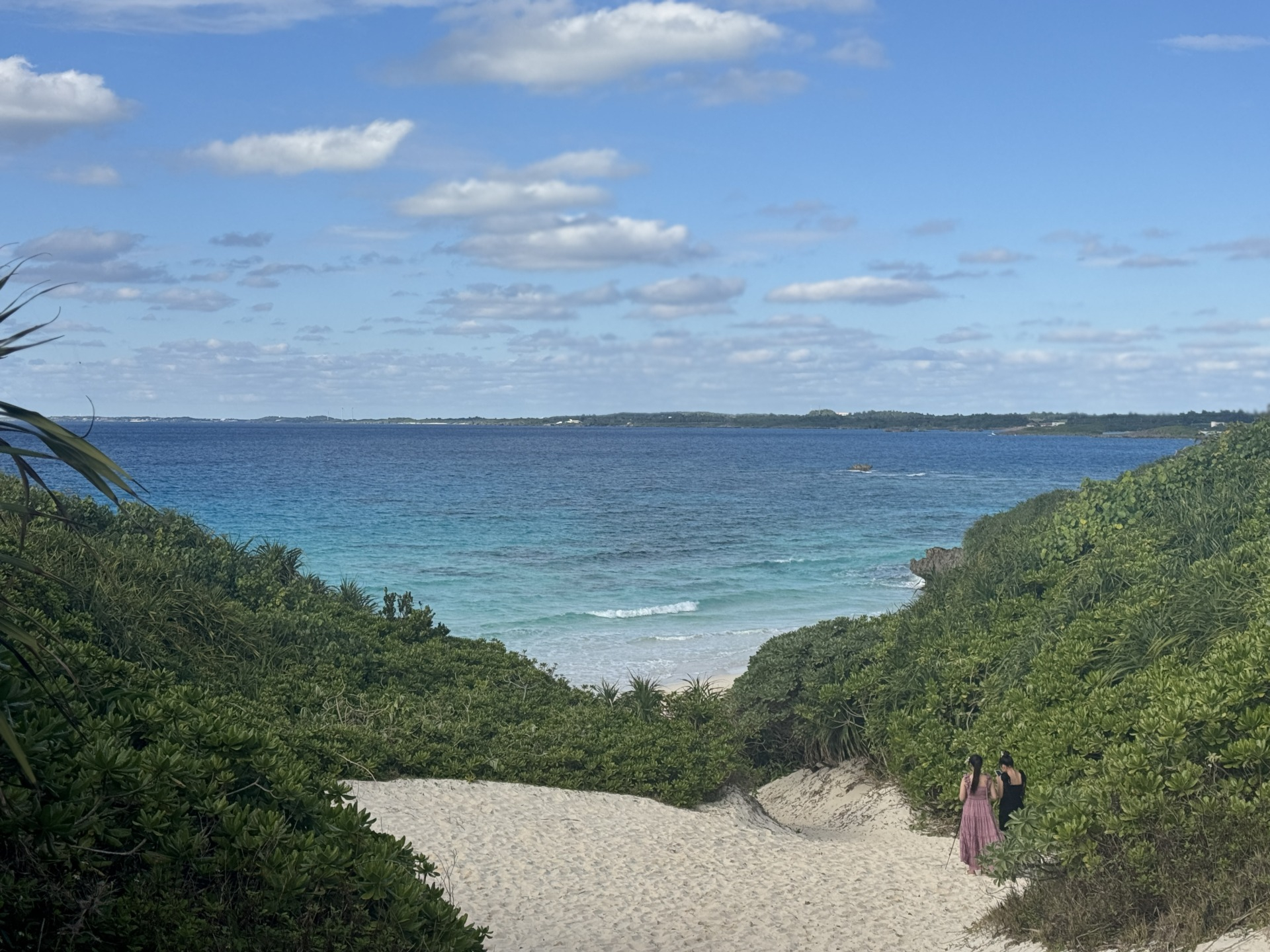 駐車場からビーチへは徒歩で5分ほどの砂道を下る形になります。砂も柔らかく足元が不安定なため、歩きやすい靴での訪問がおすすめです。