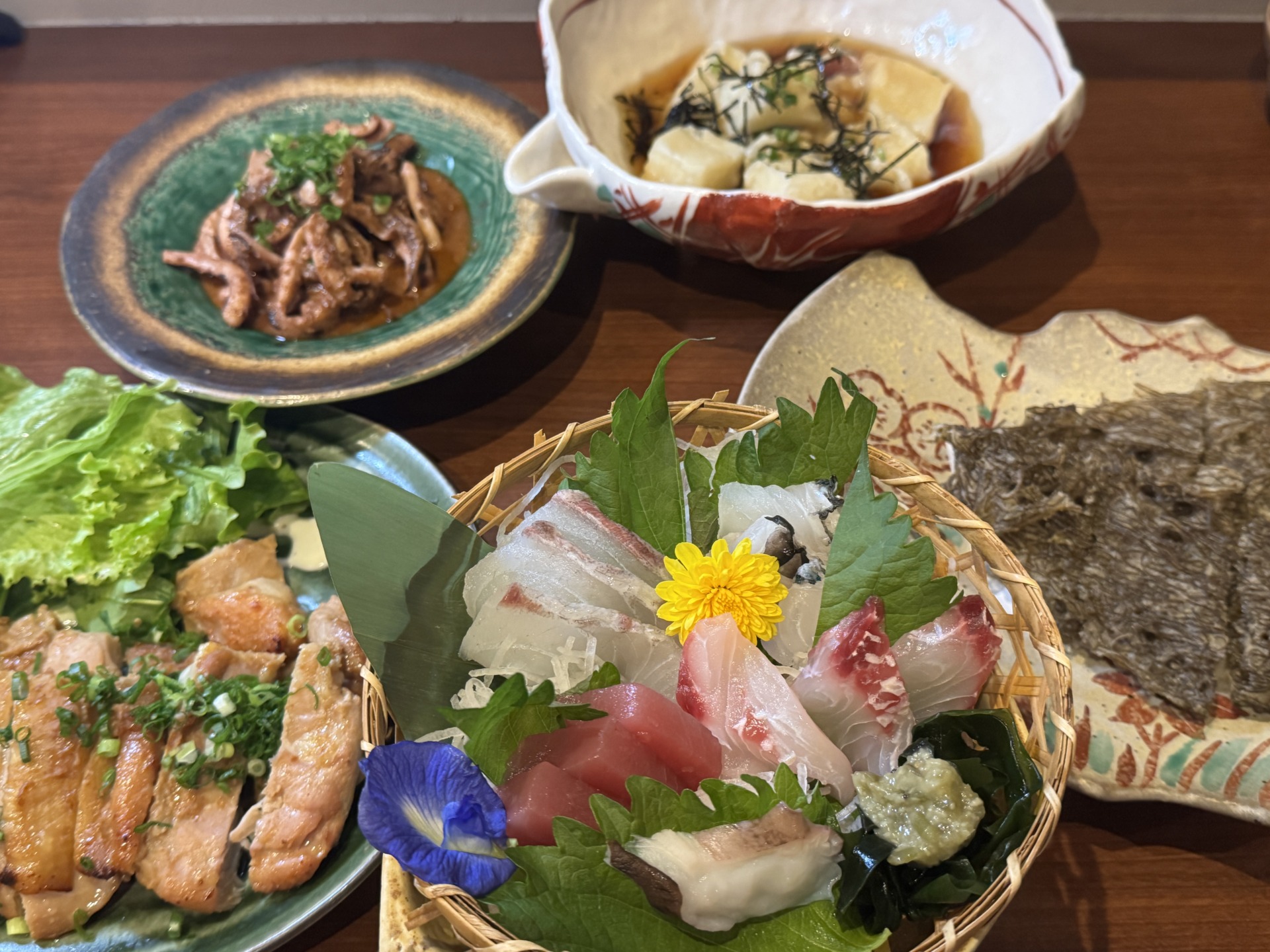 刺身盛り合わせは、その日仕入れた新鮮な魚を中心に提供され、観光客からも評価の高い一皿です。
