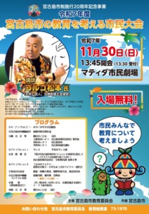 今年は宮古島市制施行20周年の節目となる年をお祝いするとともに、宮古島市の教育に対する市民の関心と理解を一層深めるため教育の日の関連行事として『宮古島市制施行20周年記念事業 令和7年度 教育を考える市民大会』が開催されます。