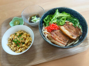 鰹出汁と豚出汁のあっさりしたお出汁が特徴的でとろける三枚肉も相性がバッチリです😋今回は沖縄の炊き込みご飯の『じゅーしー』とのセットを頼んでみました〜✨付け合わせのもずく酢も美味しかったです💕