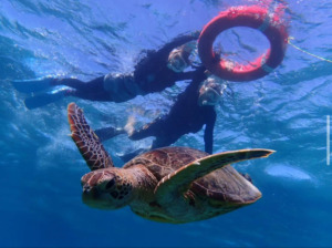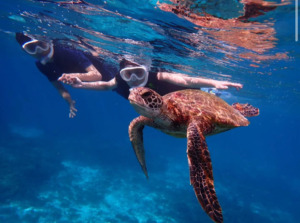 泳ぎながらウミガメを探し記念撮影!ウミガメを見た後熱帯魚や珊瑚を見に行きます。
